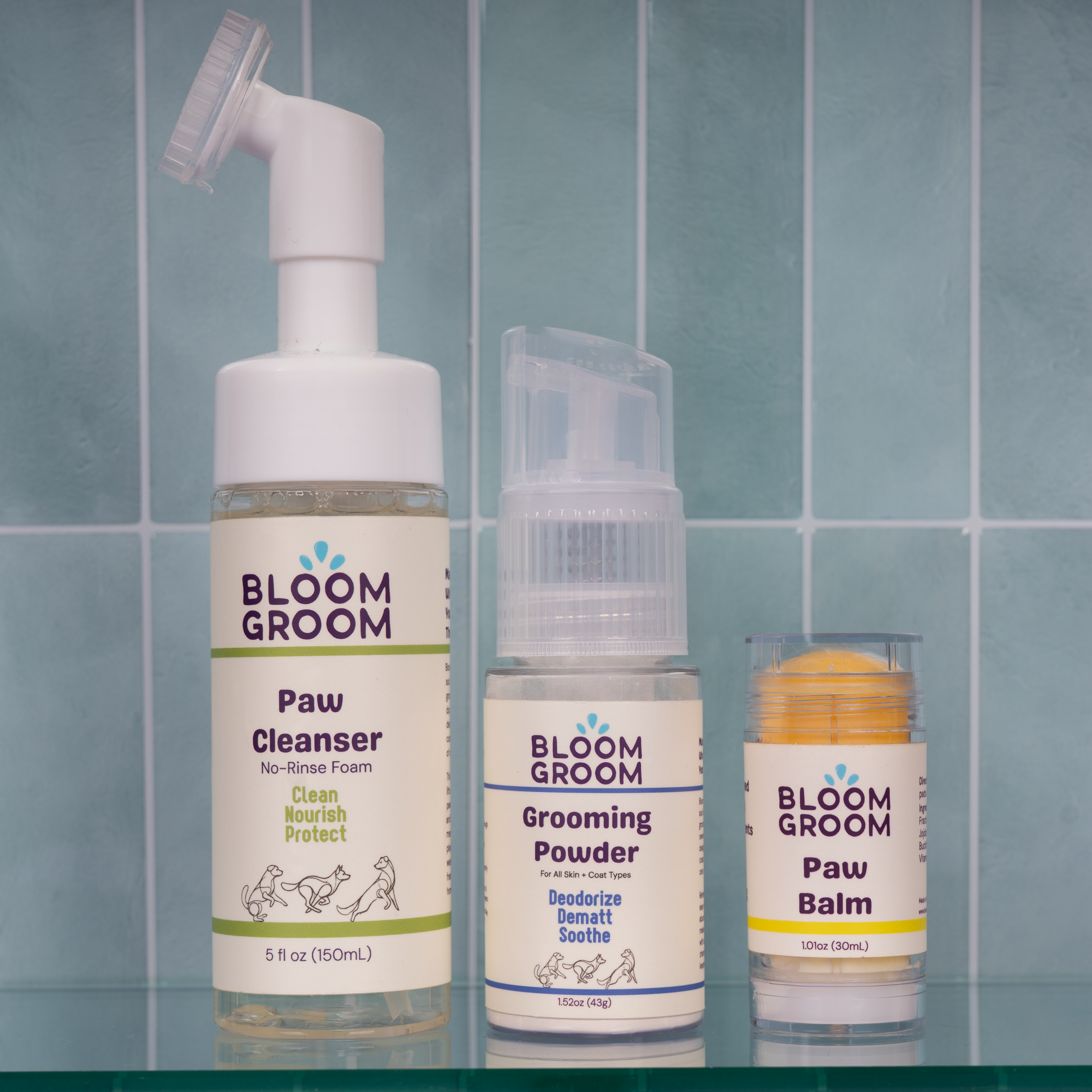 Poof the Grooming Powder to refresh the coat, use the Foaming Paw Cleanser to clean paws, and finish with the Paw Balm to keep pads soft and protected.